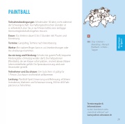 Ausrüstung und Kleidung: Schuhe mit gutem Pro l, bequeme Kleidung (die schmutzig werden darf). Die Farbpatronen (Paintballs), die am Körper sofort platzen, sind mit abwaschbarer Lebensmittelfarbe gefüllt. Die Spezialausrüstung wird vom Veranstalter gestellt.