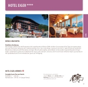 Nur wenige Schritte von der Bergstation der Lauterbrunnen-Mürren-Bahn erleben Sie unvergessliche Tage im ungezwunge- nen und herzlichen Ambiente des traditionsreichen First-Class-Hotel Eiger. Geniessen Sie hier in 1.650 m Höhe im autofreien Mürren das eindrucksvolle Panorama von Eiger, Mönch und Jungfrau und erleben Sie besondere Gaumenfreuden im Eiger Stübli. Zum Relaxen stehen das Hallenbad mit Sauna und Solarium sowie das 200 m vom Hotel entfernte Alpine Sportzentrum mit Sprudelbad und 25 m Innenbecken gratis zur Verfügung.