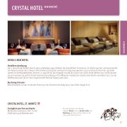 Das Crystal Hotel brilliert durch seine einmalige Lage inmitten des berühmten Ferienortes St. Moritz auf der sonnenverwöhn- ten Alpensüdseite der Schweiz. Alle Zimmer und Suiten verkörpern ungezwungenen Luxus und verströmen das spezielle warme Arvenholzambiente, welches so typisch für das Engadin ist und die Gäste sich sofort wohl fühlen lässt. Im Ristorante Grissini werden Sie auf höchstem kulinarischen Niveau mit raffinierter mediterran-italienischer Küche verwöhnt. Das Crystal Well t bietet auf 350 m2 eine inspirierende Welt für Körper und Geist.