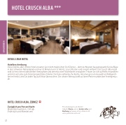Dieses kleine, aber schöne Hotel erwartet Sie in dem malerischen Dorf Zernez – dem wichtigsten Ausgangspunkt für Aus üge in den Schweizer Nationalpark und nur 30 Minuten von St. Moritz, Scuol, Klosters und Livigno entfernt. Das Crusch Alba Hotel wird Sie mit seiner traditionellen Atmosphäre und den massiven Holzmöbeln verzaubern. Freuen Sie sich auf helle, freundliche und mit viel Liebe zum Detail eingerichtete Zimmer. Die feine einheimische Küche, mit einer grossen Auswahl an Wildgerich- ten im Herbst, wird Sie jeden Tag aufs Neue überraschen. Die schöne Weinauswahl zu fairen Preisen rundet den Feriengenuss ab.