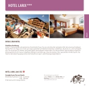 Stolze 13 Viertausender umsäumen das Gletscherdorf Saas-Fee wie eine Muschel und geben ihm den unverwechselbaren Namen Perle der Alpen. Das Hotel Larix liegt zauberhaft am Waldrand direkt bei Seilbahnen, Skischule, Eis- und Curlingbah- nen. Die insgesamt 25 Zimmer sind komfortabel und behaglich eingerichtet. Für den perfekten Tagesausklang sorgen der Erholungsbereich mit Sauna, Dampfbad, Whirlpool und Massage sowie die kulinarischen Spezialitäten im Restaurant. Das Hotel ist der ideale Ausgangsort für eine Vielzahl von Sport- und Erholungsmöglichkeiten.
