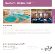 Nur 50 Autominuten von Wien entfernt liegt das Sporthotel am Semmering, eingebettet in die atemberaubende Natur- landschaft der Wiener Alpen. Die geschmackvoll eingerichteten Zimmer sollen Ihren Aufenthalt im Hotel so angenehm wie möglich gestalten. Geniessen Sie Ihr Frühstücksbu et im Panorama-Restaurant, wo Sie mit österreichischen Spezialitäten verwöhnt werden. Darüber hinaus verfügt das Hotel über eine Café-Bar und eine Terrasse mit herrlichem Panoramablick auf die Wiener Alpen. Das Hallenbad, die Sauna, das umfangreiche Massageangebot und der Fitnessraum laden Sie nach Ihren Aktivitäten zur Entspannung ein.