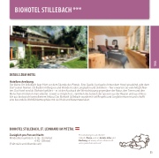 Der kleine Ort Stillebach liegt 9 km vor dem Talende des Pitztals. Eine Quelle, fast lautlos hinter dem Hotel sprudelnd, gibt dem Dorf seinen Namen. Ob Baden im Bergsee und Wandern oder Langlaufen und Skifahren – hier erwarten Sie viele Möglichkei- ten. Das Hotel wird als Biohotel geführt – es ist der Ausdruck der Wertschätzung gegenüber der Natur, den Tieren und den Menschen mit denen man arbeitet. Soweit es möglich ist, stammen die Zutaten der Speisen aus der Region und ausschliess- lich aus biologisch kontrolliertem Anbau. Das Biohotel Stillebach wurde mit viel Respekt und Sorgfalt renoviert und scha t eine besondere Wohlfühlatmosphäre mit viel Holz und Naturmaterialien.