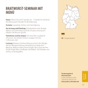 Leistung: Bratwurst-Seminar, Betreuung durch den Metzger- meister, Metzgerei-Führung, Herstellung von fränkischer Bratwurst, Bratwurst-Menü mit 6 Gängen, Wurst-Quiz mit Preis für den Sieger, Wurst-Grußkarte vom Erlebnis. Die Getränke sind im Preis nicht inbegri en.