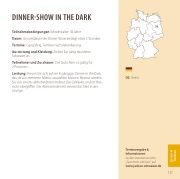 Leistung: Freuen Sie sich auf ein 4-gängiges Dinner in the Dark, das sie aus mehreren Menüs auswählen können. Betreut werden Sie von einem sehbehinderten Kellner. Die Getränke sind im Preis nicht inbegri en. Der Abend endet mit einem Glas Sekt in der Lounge.