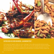 Einen gesunden Appetit sollten Sie schon mitbringen. Denn selbstverständlich dürfen Sie alles, was Sie zubereiten, auch probieren. Also – hauen Sie rein, bis die Chitinpanzer knacken! Schließlich sind Heuschrecken, Würmer & Co. richtig lecker, super gesund und haben außerdem eine Extra- portion Eiweiß! Lassen Sie diese Leckerbissen nicht entwischen und tischen Sie Ihren Gästen mal was Aufregendes auf!