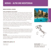 Das Kurhaus auf der Passerpromenade ist das Wahrzeichen der Südtiroler Kurstadt. Mit der neuen Therme ist Meran nicht nur um eine Wohlfühl-Attraktion, sondern auch um ein architektonisches Highlight reicher. Der eindrucksvolle Kubus aus Glas und Stahl ist das Herzstück des neuen Thermengeländes an der Südseite der Passer. Die Botanischen Gärten von Schloss Trauttmansdorff in Meran haben sich das Güte- siegel „Schönste Gartenanlage Italiens“ redlich verdient. Spazierwege schlängeln sich durch Wasser- und Terrassengärten den Hang empor, führen in den Sinnes- garten oder in den japanischen Garten, auf den Kakteen- und Sukkulentenhügel oder zu Kulturp anzen des Südens wie Olivenbaum und Weinrebe.